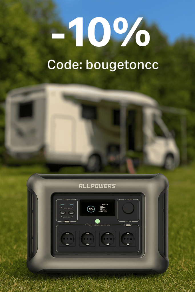 La batterie nomade ALLPOWERS que j’utilise au quotidien en camping-car pour alimenter mes appareils électroniques. Economisez 10% avec le code promo bougetoncc